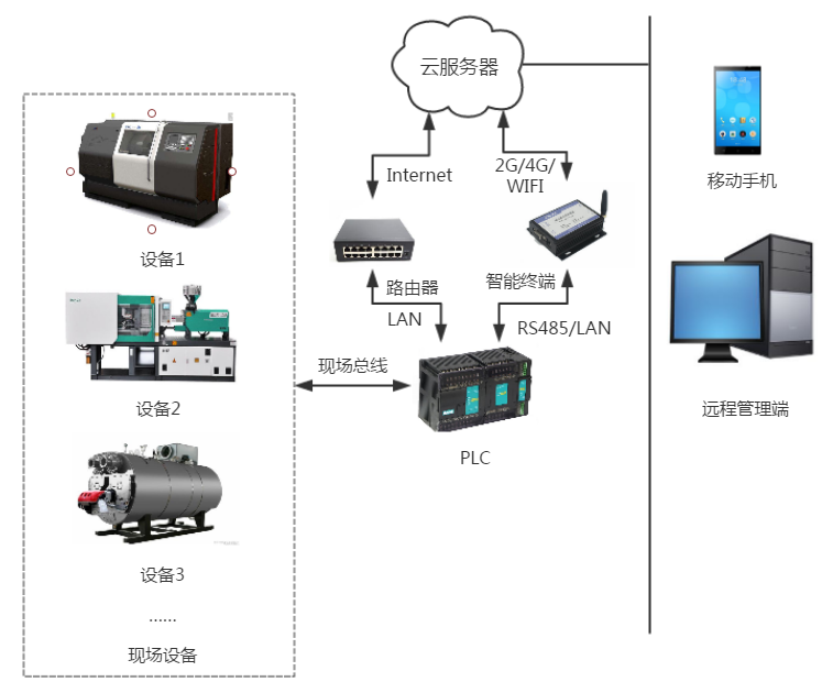 设备远程监控是建立在现代的计算机技术、通信技术、控制技术以及图形技术上的一个新的应用。远程实时监控系统,是本地计算机系统通过网络系统特别是对远端的控制系统进行监测与控制的系统。系统结构包含现场智能设备层、SCADA数据采集传输层、平台层以及应用层。通过智能采控终端采集设备的各项数据,将数据上传到云平台,存储、整理、分析,通过智能应用系统实现时时在线监控、记录、查询、统计、分析、修改、报警等操作,实现远程智能化管理,提高企业智能化管理水平。